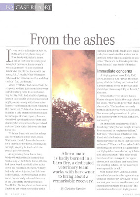 So as I was going through a pile I stumbled upon an extra copy of Equus magazine, August 2010. That issue contained an article about Suki and the fire. As I sat on the floor reading it, every single emotion that I had experienced came flooding back all at once. The graphic photos made me wince, and I could understand why some people would have thought that she was in a lot of pain. I just sat there and cried. Reading again, what veterinarians' impressions were, along with treatment goals and potential complications made me shake my ahead in amazement....how was it even possible for Suki to overcome such odds! The dedication of the doctors and nurses kept Suki comfortable guiding her to recovery. I have always said that Suki's own amazing fortitude also kept her fighting to win the battle to survival. Others have maintained that my love for Suki evidenced by the time I spent with her during her 7 weeks in ICU also showed her the way. A comment made by Dr. Kelly Kalf helped me to understand Suki's determination: "Day 2 Suki lifted her head, and we never looked back". Suki ate, drank and demanded treats and attention the same way she had before the fire. We were always prepared for major setbacks and complications, which thankfully never came. Some of the photos in the article were incredibly difficult to look at and I remember receiving some comments about how selfish and cruel I was for putting my horse through such an ordeal. I had been prepared to make the decision for Suki to be euthanized if at any time she was thought to be in extreme pain or she would live a life that was not full and enjoyable. That was a decision I never had to make.